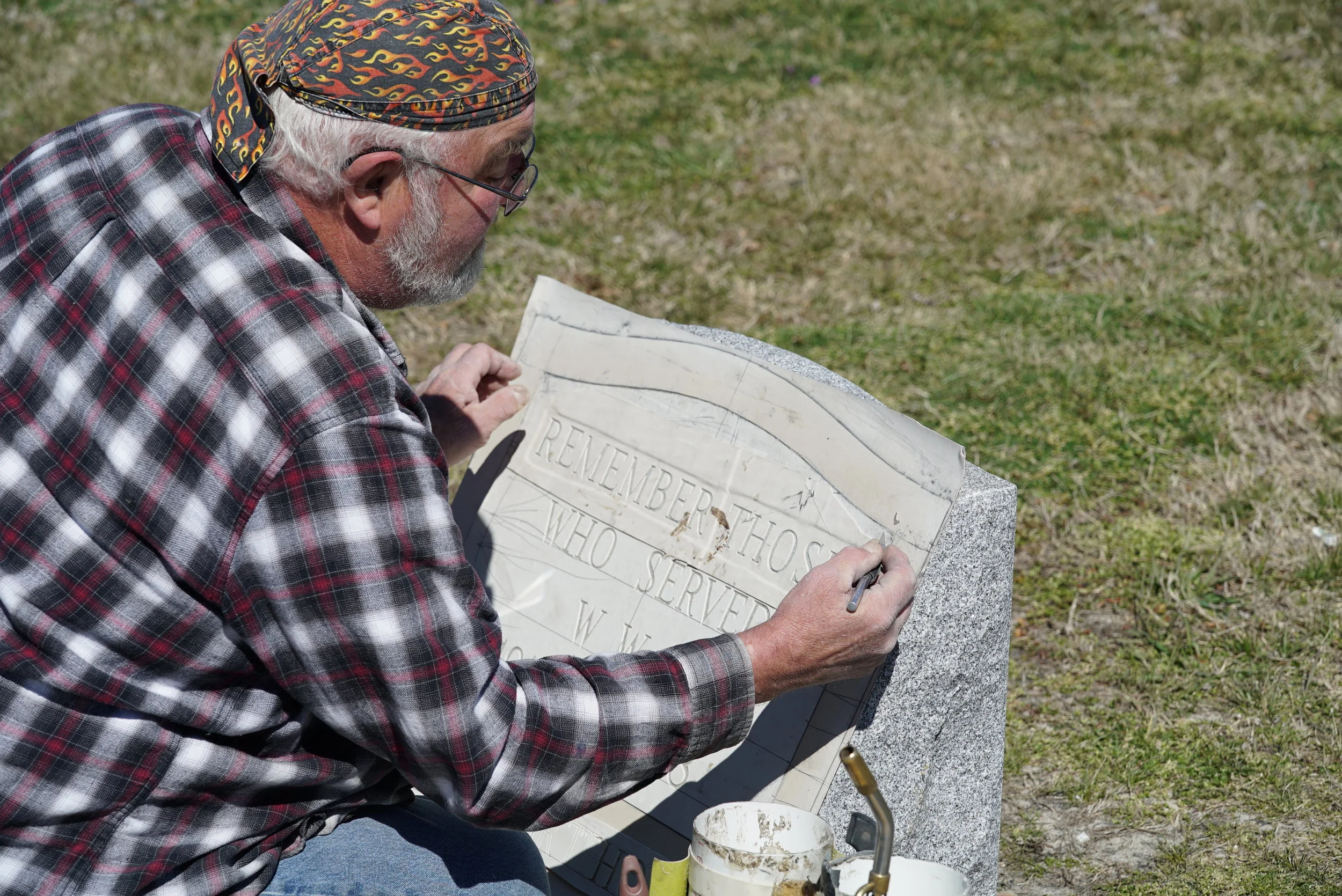 A tradesman doing an inscription job on a slant marker. In metropolitan Philadelphia, expect headstone inscription work to take 90 days. (Not many people do this sort of work.)